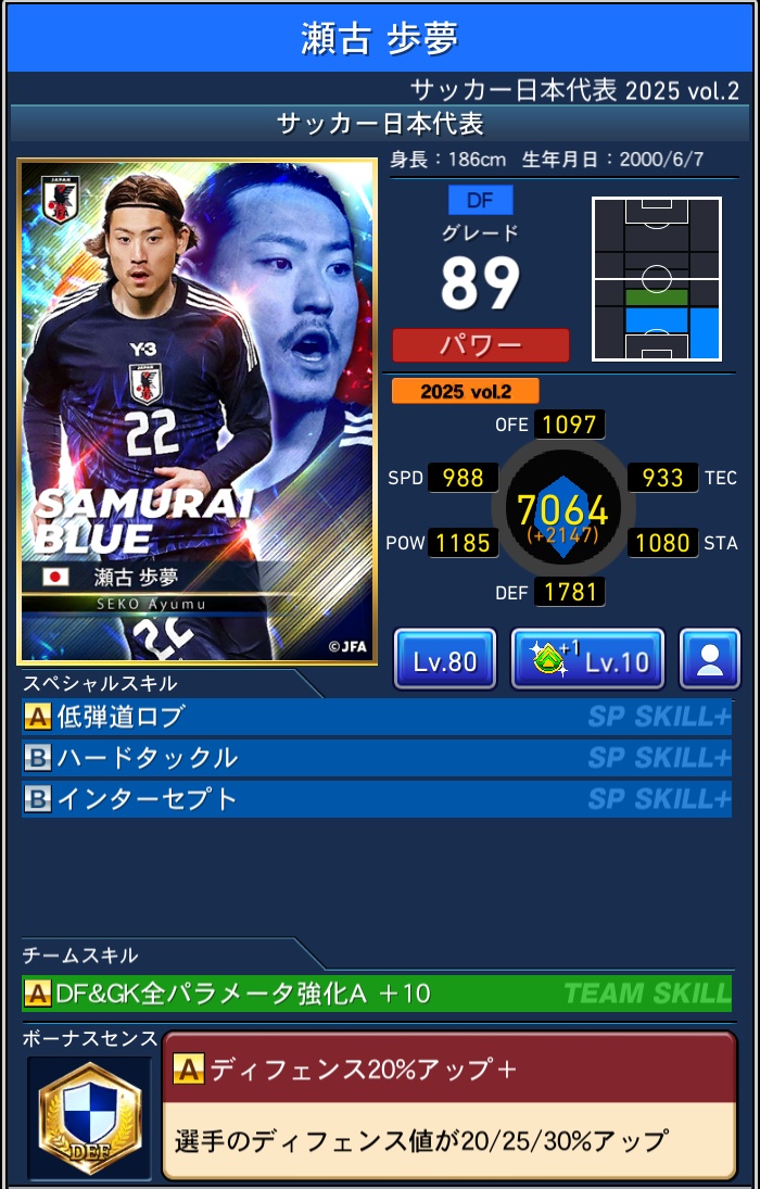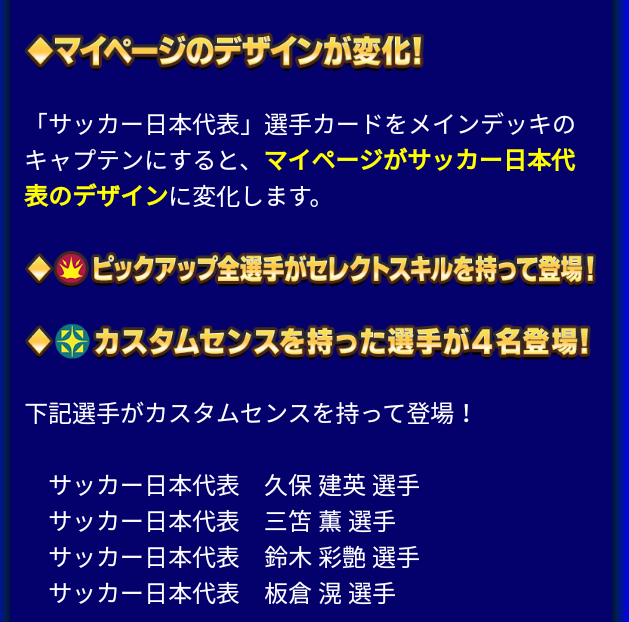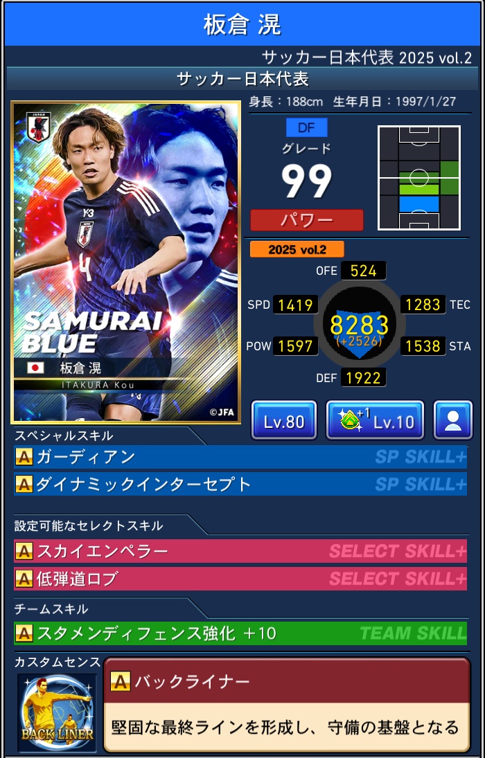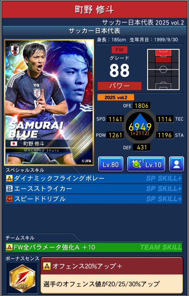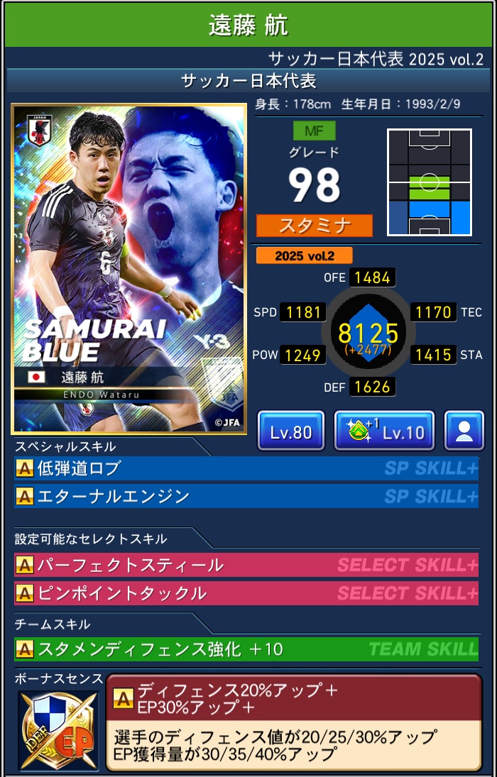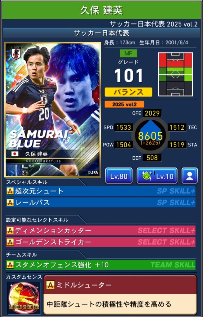 【Jクラ攻略】2025年度 日本代表 2025 11/17 サッカー日本代表 限定カード 2025年11月17日 目次2025 日本代表 & ピックアップ について 排出期間 2025年11月10日~2025年12月12日 排出選手『日本代表編』 【GK:ゴールキーパー】 【DF:ディフェンダー】 【MF/FW:ミッドフィルダー/フォワード】 サッカー日本代表 限定カード よかったらシェアしてね! URLをコピーしました! URLをコピーしました! 【Jクラ】「2025 Jリーグクライマックス!エンブレムゲッター」徹底攻略!特効12倍&霜月コイン・MVPコイン報酬まとめ 【Jクラ攻略】2025年度 月間ベストゴール(9月) 関連記事 【Jクラ攻略】2025年度 Levain CUP MVP/ニューヒーロー賞 2025年11月28日 【Jクラ攻略】2025年度『J2編』 JOKERS 2025年11月28日 【Jクラ攻略】2025年度『J1編』 JOKERS 2025年11月28日 【Jクラ攻略】2025年度 月間ベストセーブ(9月) 2025年11月28日 【Jクラ攻略】2025年度『J2編』FOCUSED PLAYERS Vol.6 2025年11月19日 【Jクラ攻略】2025年度『J1編』FOCUSED PLAYERS Vol.6 2025年11月19日 【Jクラ攻略】2025年度 月間ベストゴール(9月) 2025年11月17日 【Jクラ攻略】2025年度『J2編』 HIGHRISES 2025年11月6日 コメント コメントする コメントをキャンセルコメント ※ 名前 ※ メール ※ サイト 次回のコメントで使用するためブラウザーに自分の名前、メールアドレス、サイトを保存する。