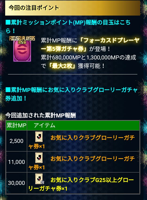 「Jクラ祭り!アディショナルチャレンジ」は、MPを集めるほど報酬が豪華になるやり込み型イベントです。特に、フォーカスドプレーヤー第5弾ガチャ券やG85以上ガチャ券を目指して、チャレンジに挑戦しましょう!