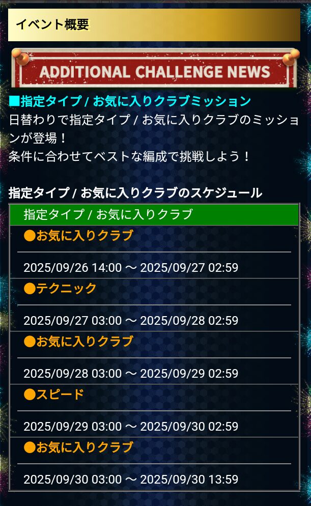 | 2025/09/28 03:00 ~ 09/29 02:59 | お気に入りクラブ |
