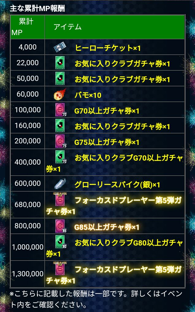 | 1,300,000 | フォーカスドプレーヤー第5弾ガチャ券×1 |