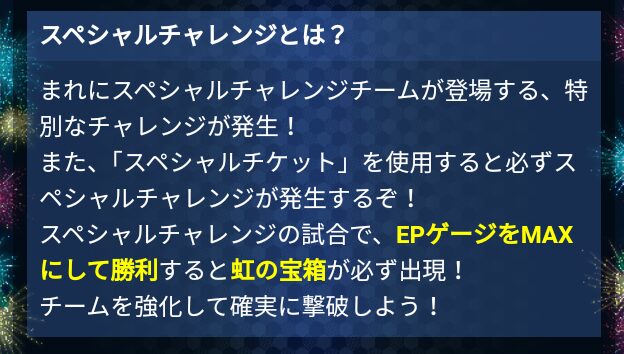 試合中にランダムで「スペシャルチャレンジチーム」が登場し、勝利することで虹の宝箱が出現します。EPゲージMAXで勝利すれば、虹の宝箱が確定出現!
