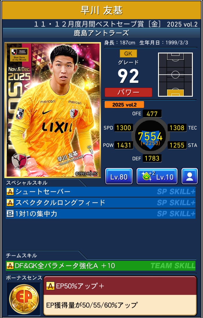 【Jクラ攻略】2025年度 月間ベストセーブ(11-12月) 2026 2/09 限定カード 2026年2月9日 目次2025 月間ベストセーブ(11-12月)について 排出選手 【鹿島アントラーズ】 【V・ファーレン長崎】 限定カード よかったらシェアしてね! URLをコピーしました! URLをコピーしました! 【Jクラ攻略】2025年度 TIMESLIP STAR Vol.38 【Jクラ攻略】2025年度『J1編』TOPSCORERS 関連記事 【Jクラ攻略】2025年度 月間ヤングプレイヤー(9月-12月) 2026年2月9日 【Jクラ攻略】2025年度『J2編』TOPSCORERS 2026年2月9日 【Jクラ攻略】2025年度『J1編』TOPSCORERS 2026年2月9日 【Jクラ攻略】2025年度 TIMESLIP STAR Vol.38 2026年1月28日 【Jクラ攻略】2025年度 月間ベストゴール(11月-12月) 2026年1月19日 【Jクラ攻略】2025年度『J2編』TOPASSISTS 2026年1月19日 【Jクラ攻略】2025年度『J1編』TOPASSISTS 2026年1月19日 【Jクラ攻略】2025年度『J2編』MAJESTICS 2026年1月7日 コメント コメントする コメントをキャンセルコメント ※ 名前 ※ メール ※ サイト 次回のコメントで使用するためブラウザーに自分の名前、メールアドレス、サイトを保存する。
